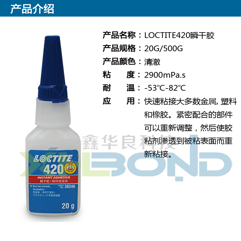 樂泰420是一種單組分,快速固定,室溫固化,通用工業(yè)級氰基丙烯酸酯膠粘劑。loctite420的低粘度特性使它非常容易透過預組裝的部件。樂泰420使用經(jīng)濟,對金屬、塑料和橡膠具有強烈粘接性能。