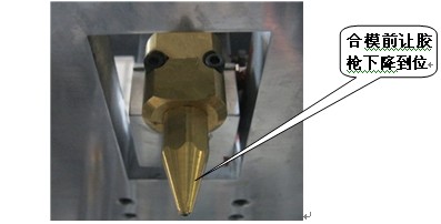 5)手動合模壓緊模具,讓膠槍頭對準(zhǔn)模具進膠口;