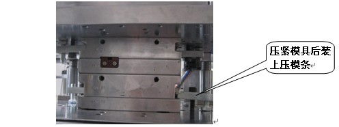 6)調(diào)好模具進膠口與膠槍頭的相對位置后,用壓模條鎖緊模具的上模和下模;